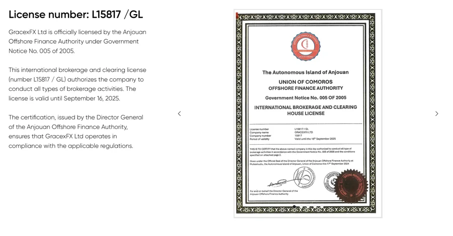 Gracex positions itself as a modern broker that frees traders from outdated trading models. With a strong emphasis on technology, open market conditions, and user-friendly platforms, it targets both beginners and advanced traders. Supervised by the Union of Comoros (Anjouan) under license L15817/GL, Gracex ensures segregated client funds and full compliance with KYC and AML standards, providing a secure legal framework.